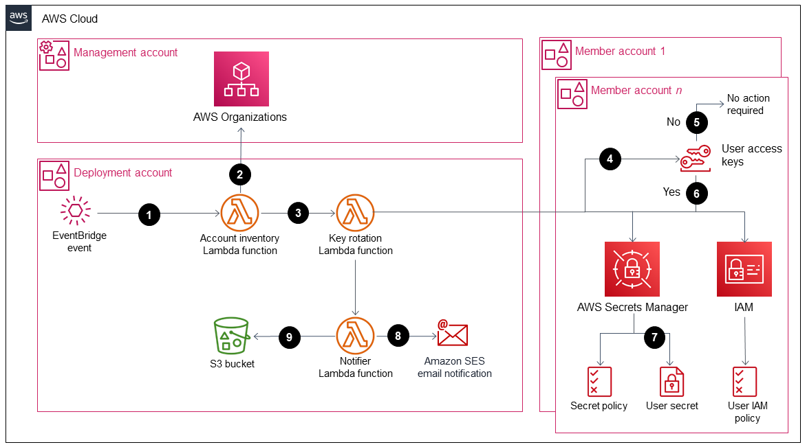 Lambda functions and Amazon CloudWatch automatically performs these actions. You can then retrieve the new access key pair and replace them in your code or applications. The rotation, deletion, and deactivation periods can be customized.