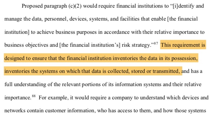 It turns out that you’ll need to inventory the data in your system — that is find and classify the data— to help evaluate risks. It’s an important point, which is found in the discussion of the changes. I’ve taken a screenshot of the section of the NPRM wherein this is explained. Please gaze upon it and appreciate the implications.