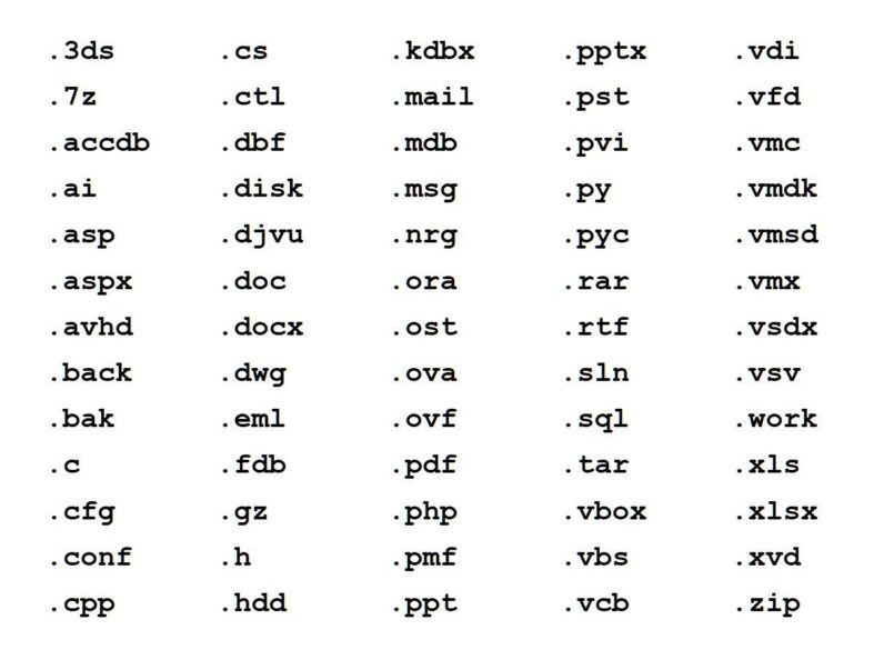 Comme le fait remarquer Microsoft, « la menace tente d’écraser le code du MBR uniquement si elle est exécutée avec les droits les plus élevés (c’est-à-dire lorsque SeDebugPrivilege est activé) » — si l’utilisateur infecté ne possède pas de droits administrateur sur la machine, la menace tente de chiffrer les données utilisateur possédant les extensions suivantes :