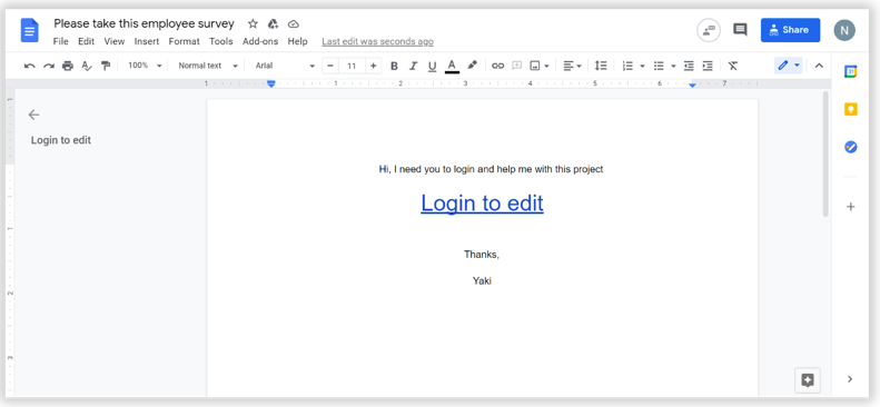Dans cet exemple, le lien de Yaki redirigera l’utilisateur vers une page ressemblant trait pour trait à une page issue du site de Varonis et demandant à l’utilisateur de saisir ses identifiants pour accéder au document partagé. Dans les courriels de ce type en circulation, les liens inclus dans ces formulaires peuvent rediriger les utilisateurs vers différents endroits en fonction de l’objectif du hacker. Les utilisateurs peuvent ainsi voir s’afficher une page imitant un service connu et demandant de se connecter, ou encore un formulaire Google leur demandant de répondre à un sondage pour tenter d’obtenir des informations sensibles, comme les réponses à des questions de sécurité courantes.